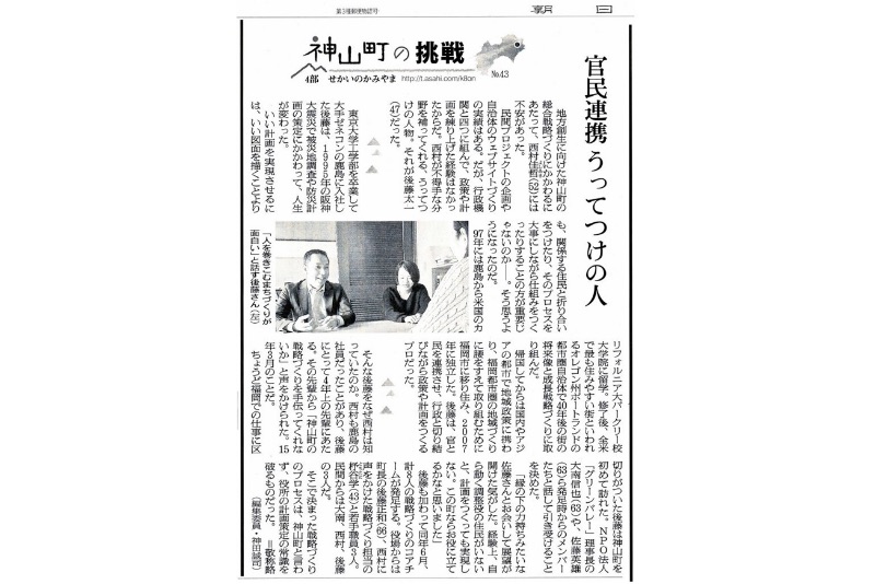 弊社後藤が朝日新聞大阪本社版夕刊の長期連載企画 『神山町の挑戦 4部 せかいのかみやま』12月5日 NO.43「官民連携 うってつけの人」に登場いたします。是非ご覧ください。